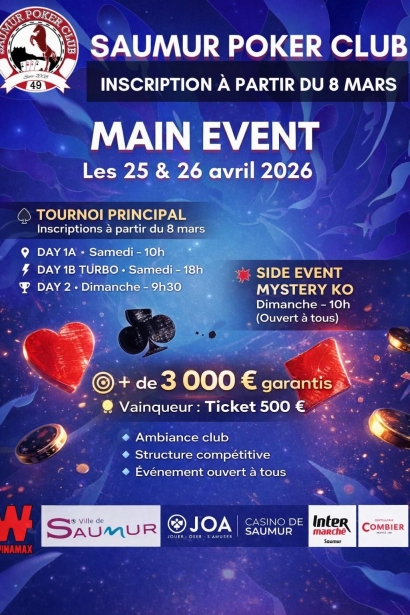 ATTENTION: la participation au championnat qualificatif en ligne implique impérativement que vous soyez disponibles les 4 et 5 Avril 2026 pour la Finale France des Clubs Winamax, le Winamax Club Trophy 2026 s'installera tout le weekend au prestigieux Marriott Hôtel Rive Gauche
